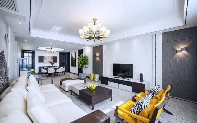 客厅采用新中式的造型和色彩搭配,空间干净、舒适