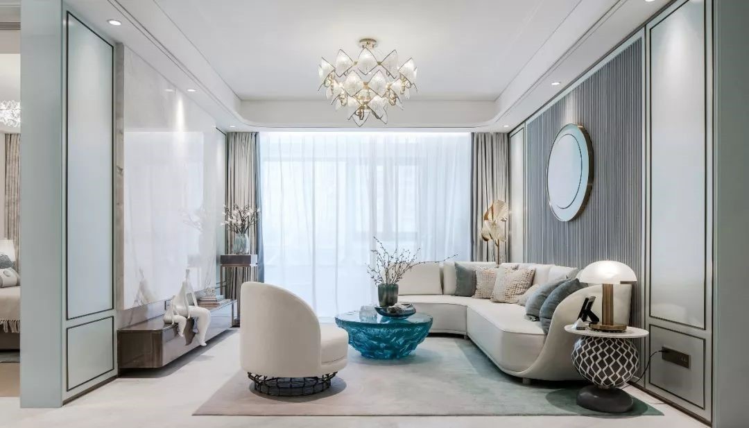 从玄关转入客厅,浪漫感、幸福感扑面而来,灰白底色的柔和调性,被蒂芙尼蓝星星点缀着,令人眼前一亮,放松身心。这种现代简约的构造,勾勒出一个精致优雅的蓝色风情家,让人身处繁华的闹市中,心情也能平静舒畅。