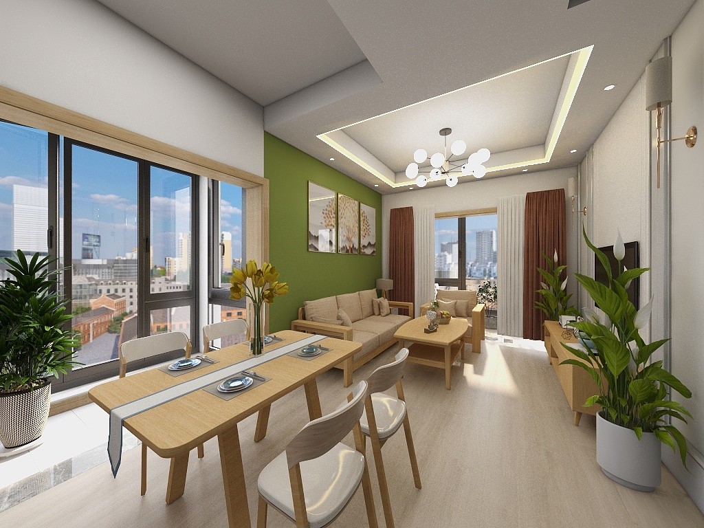 客厅做了一个“双眼皮”吊顶,沙发背景绿色搭配原木家具,“原始森林”的搭配,焦糖色的窗帘提升空间色彩鲜艳