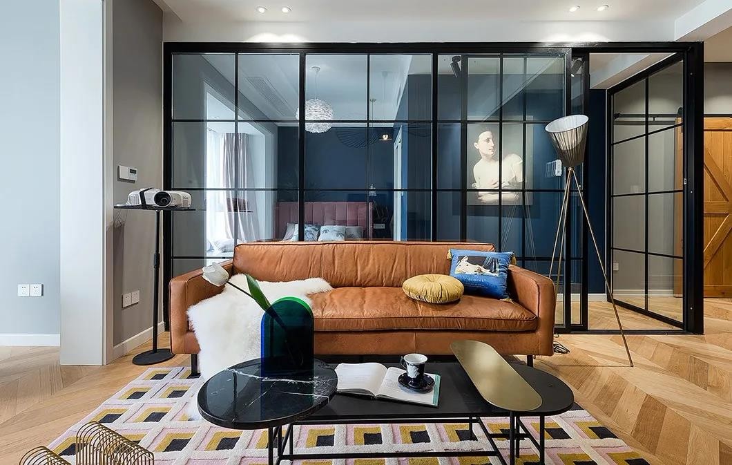 焦糖色的皮沙发,沙发两侧分别是投影仪支架、落地灯,后方隔着玻璃是卧室空间,整个空间通透而又相互分割,简单的软装布置,带来一种情趣优雅的***居住体验。
