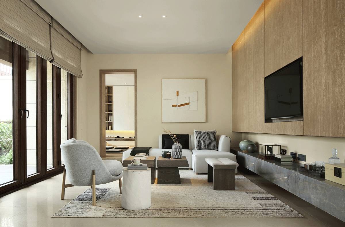 起居室得以大气简约、休闲优雅为主,运用木材和其他的天然原材料,如藤条、竹子、石材、金属,木色的家具,局部采用一些棉麻质感的布料,灯光的变化体现了稳重及奢华,以冷静线条分割空间,代替一切繁杂与装饰。
