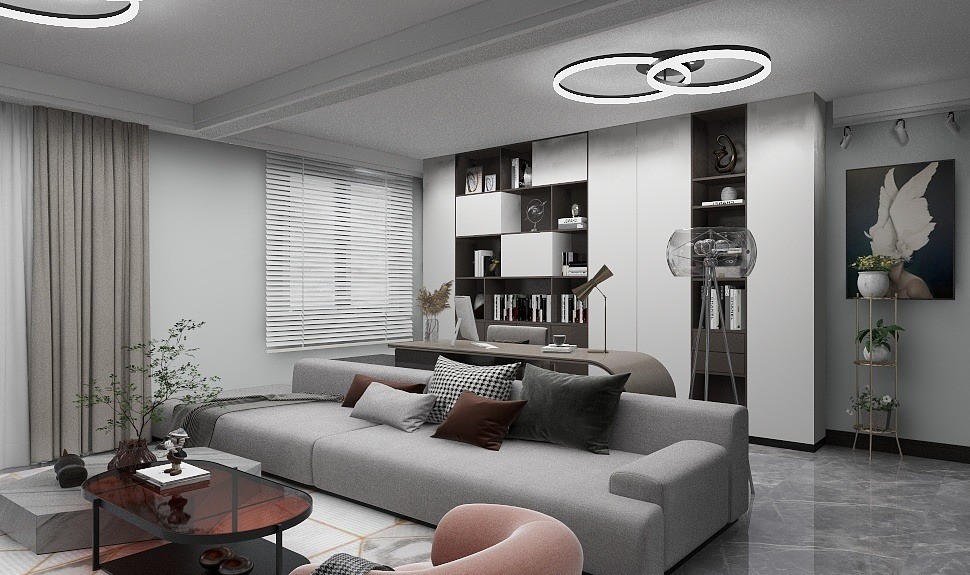 本户型最初为三室两厅户型,根据客户需要设计布局,次卧墙体拆除联通客厅,做开放式书房,增大的公共区域使用面积。厨房做半开放式,增加简餐操作台。