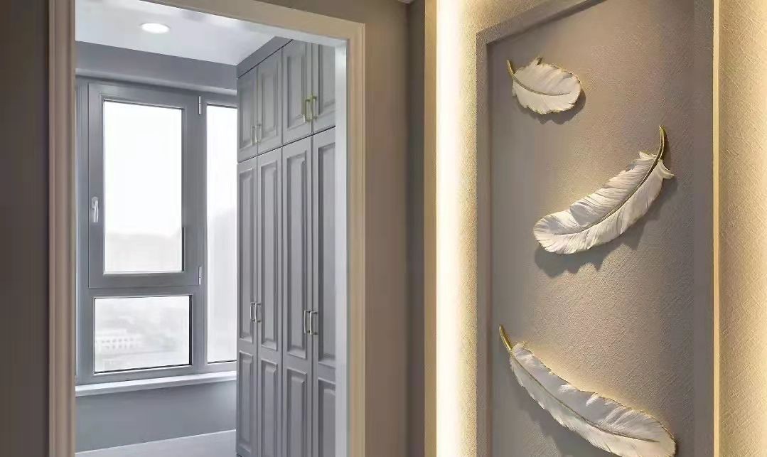 玄关,羽毛墙饰在灯光的氛围烘托下轻盈而又精致,带来温馨柔美的***印象。设计师将入户旁边的房间做成衣帽间,不仅设置了换鞋柜,还打造了更多柜子用于储物,为屋主一家的出行带来充分的便利。