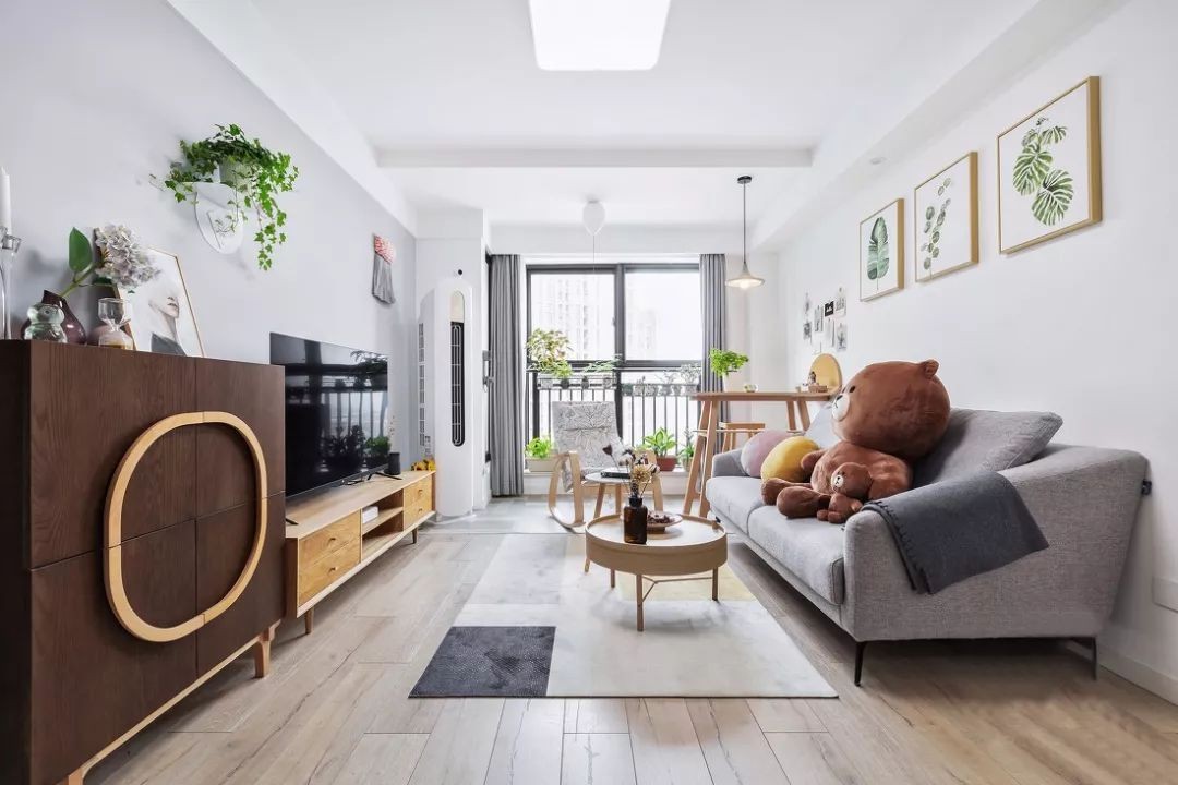 在餐厅的另一侧就是客厅空间,电视背景墙上刷成了灰色系,和布艺沙发相互呼应,两侧墙面上摆放了绿植、绿植挂画,整个空间显得更加清新。