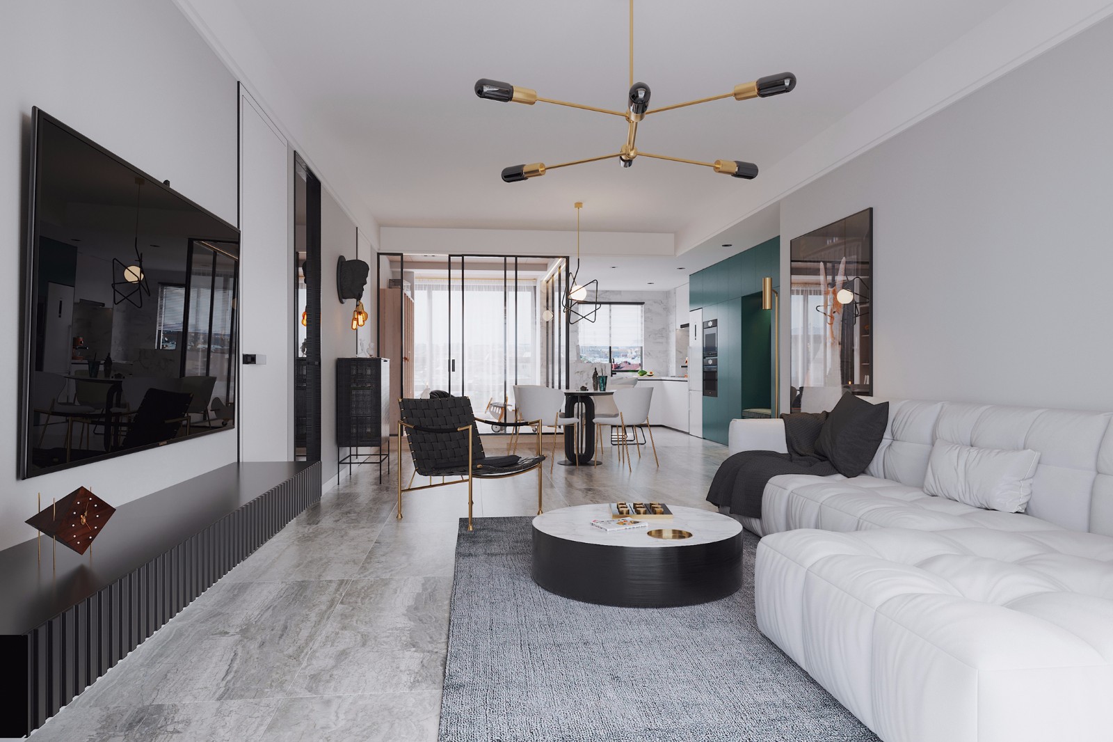 一家三口居住,夫妻俩加男孩儿,储物空间需求,娱乐区需求,工作区需求,小孩玩耍区需求。风格以现代简约加轻奢点缀。
