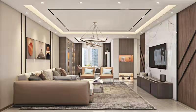 现代极简风格客厅,嵌入灯带设计,金属条收边
