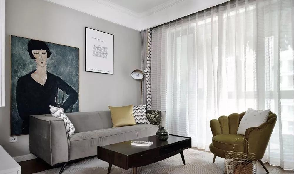 客厅灰色布艺沙发慵懒而随性 白色薄沙落地窗帘 再配一把独特造型的姜黄色单椅 空间简约且极度舒适