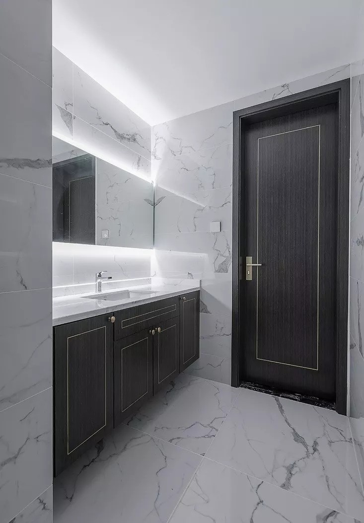卫生间把洗漱台移到外边,镜柜增加收纳,室内的门和电视墙隐形门做了统一设计,柜子门也做了呼应,全屋的格调很高。