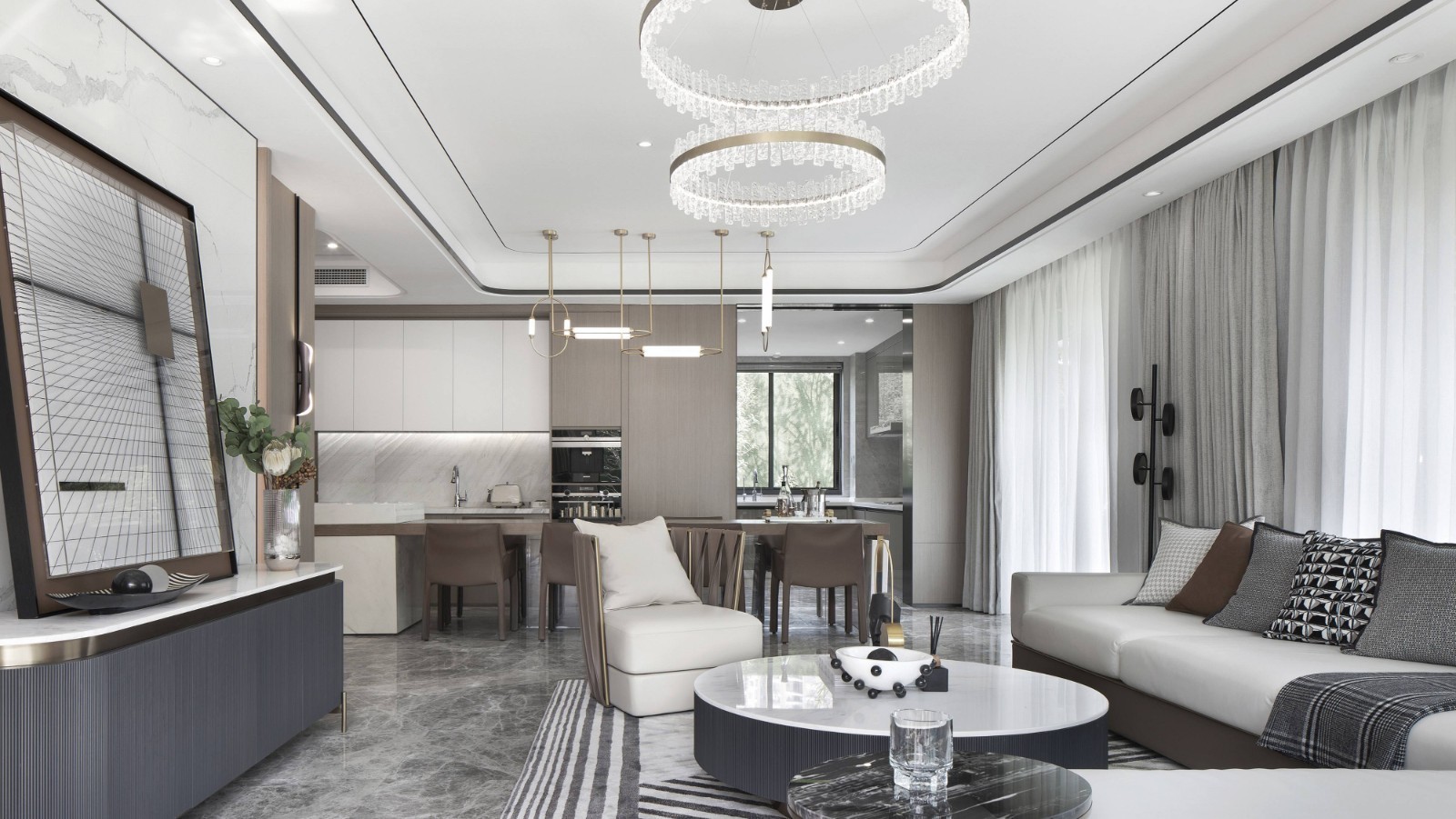设计师注重功能和空间组织,崇尚大气低奢的构成工艺,造型简洁,以咖啡色调打底,加上灰色调家私,细节处再缀以金属,整体营造出现代英伦的绅士雅致氛围。