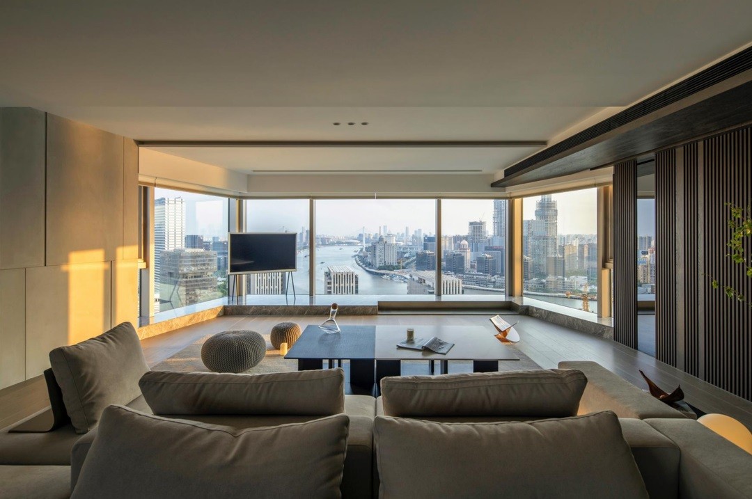 客厅墙面的一侧,我们用深色木质元素大面积铺展开,沉稳的色调能让大空间呈现稳重不轻浮的空间氛围。