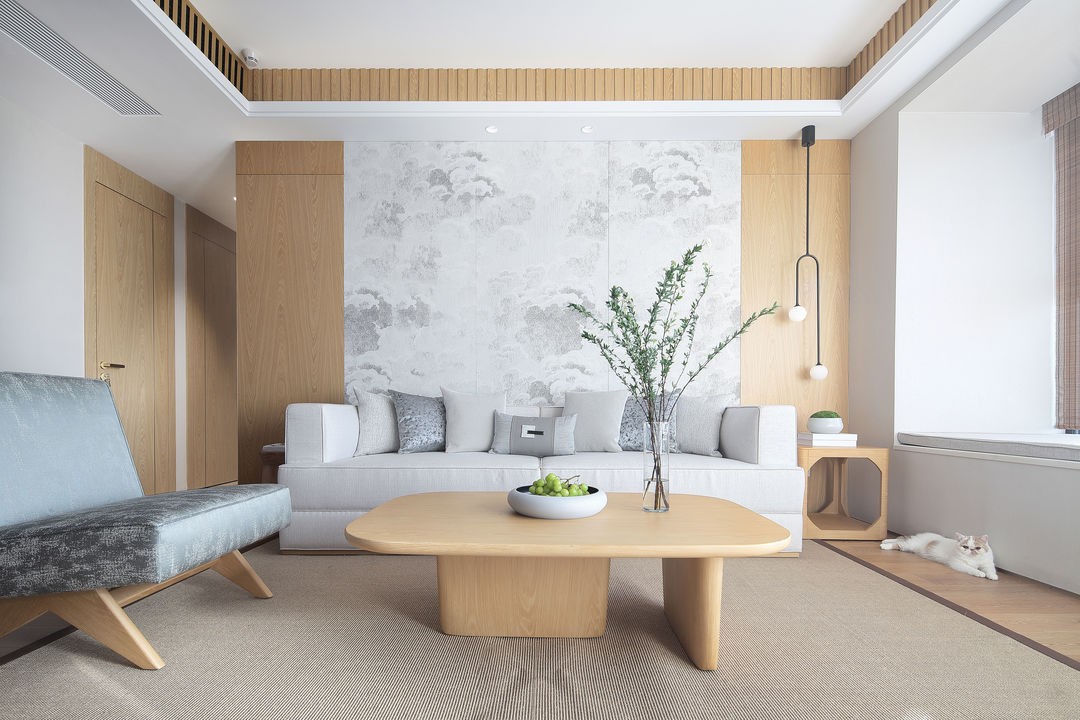 原木地板的典雅质感搭配舒适地毯,整个空间都呈现出典雅又不乏时尚的特色,在和煦的阳光照耀下,显得格外的淡雅与宁静。沙发背景墙以水墨硬包来进行特色设计,将传统元素融入整个空间设计,柔美又优雅。