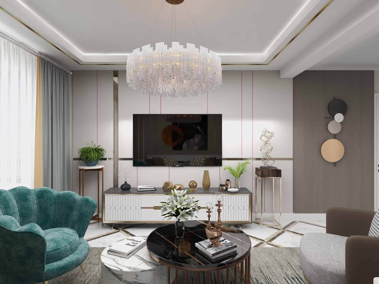 为避免素色空间带来的乏味感,以松石绿绒布沙发凳点缀,搭配金边吊顶,将精致时尚融入生活的每个细节。