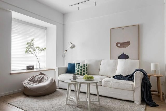 屋内的装修选择了极简风,主色调是干净的白色,局部点缀原木家具,给人一种舒适放松的居家感。现在的客厅,是以前的卧室,带有一个飘窗,保证了公共区域的采光。
