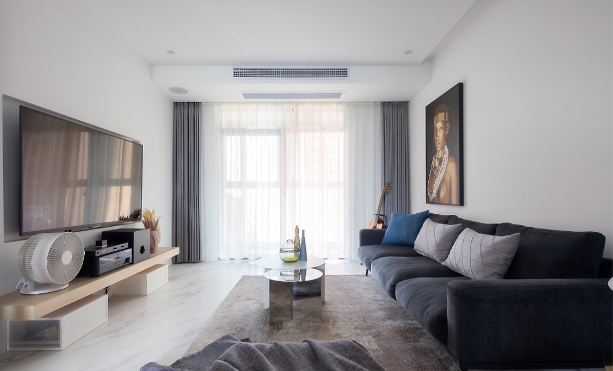 客厅整体以白色为主,电视墙做了一个木色挑空隔板,可以放低音炮和装饰品,彰显屋主的品位与格调。