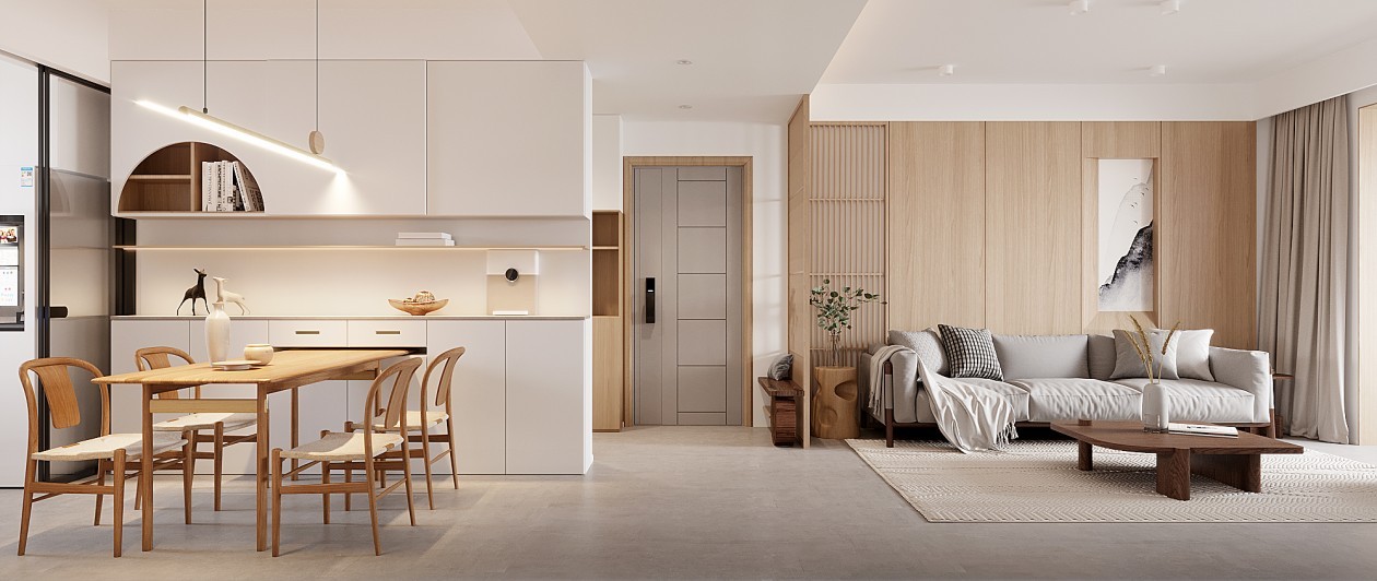 厨房和餐厅用了极窄的推拉门,增加空间的通透和流动性,木白的橱柜搭配跟客餐厅相呼应。