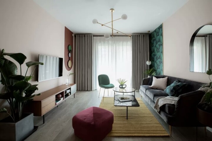 客厅通过大面积的灰白色的天花整个空间各个部分立面彩墙,让空间变得整体