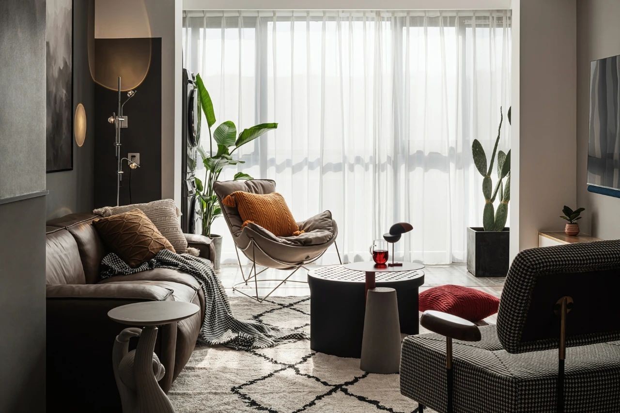 黑白色调的墙纸,细腻朦胧;墙面做了分色处理,加上氛围灯的烘托,几何图形元素融入其中,营造唯美梦幻的视觉效果。