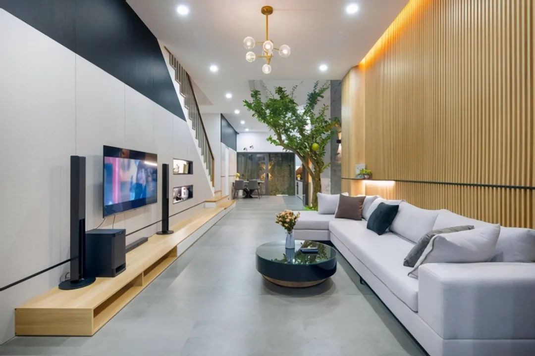 客厅与餐厅中间空白区域,造景设计,一棵树,底下满铺鹅卵石,增加绿化之外,也有利于净化公共空间的空气。