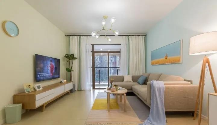 ▲ 客厅与阳台之间选用轻薄的绿色与白色纱帘搭配,双圆茶几增添时尚感。硬装简单,但并不单调。