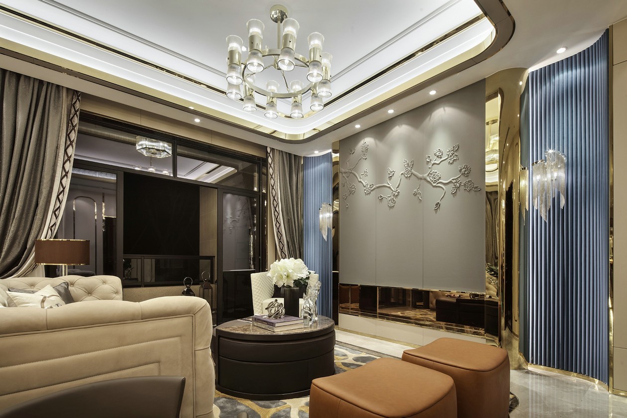 用玻璃门隔断阳台和客厅,整个空间更加明亮,在装修中加入轻奢元素,让客厅更加有质感。