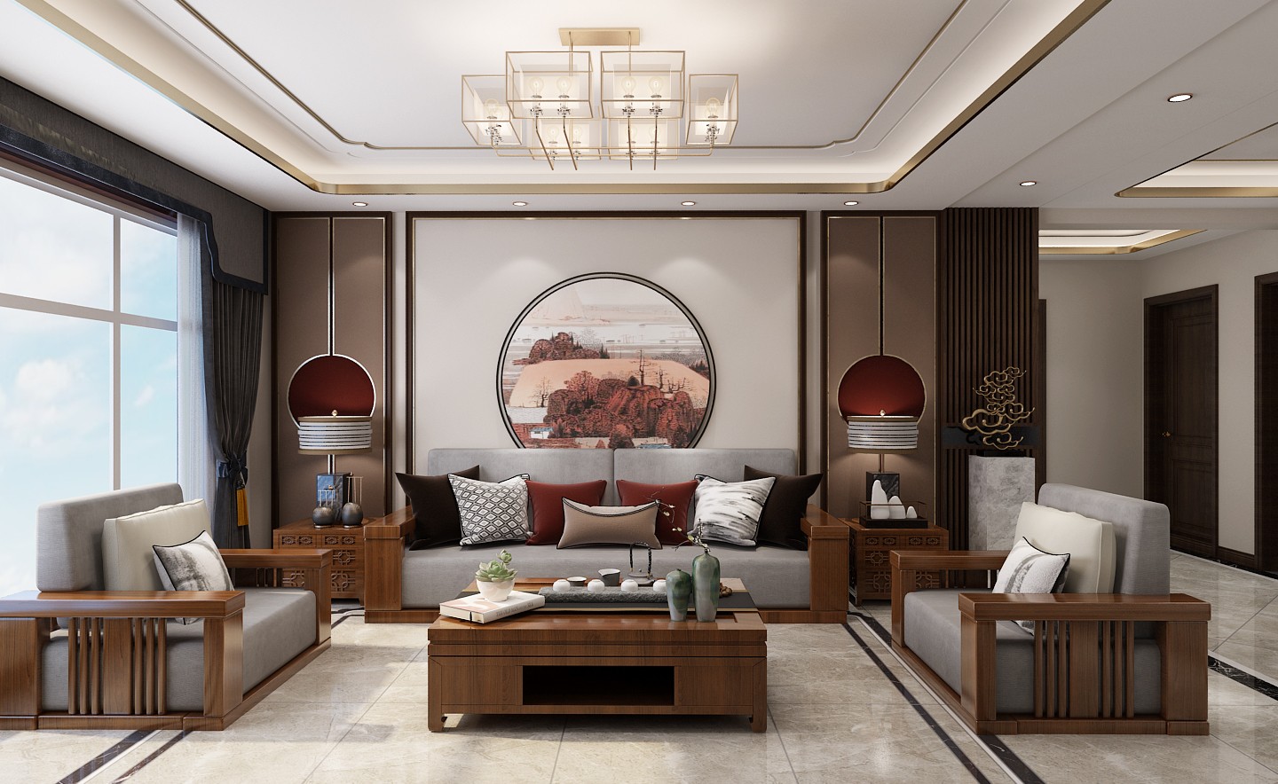 新中式,客厅效果图。
