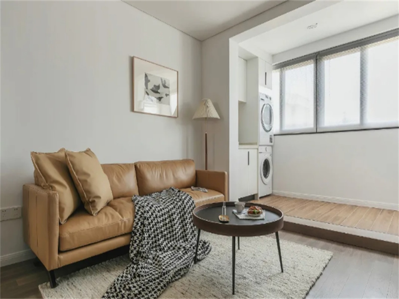 阳台一侧规划洗衣区,将洗衣机与烘干机叠放纳入,墙地面通铺木纹砖,方便打理卫生