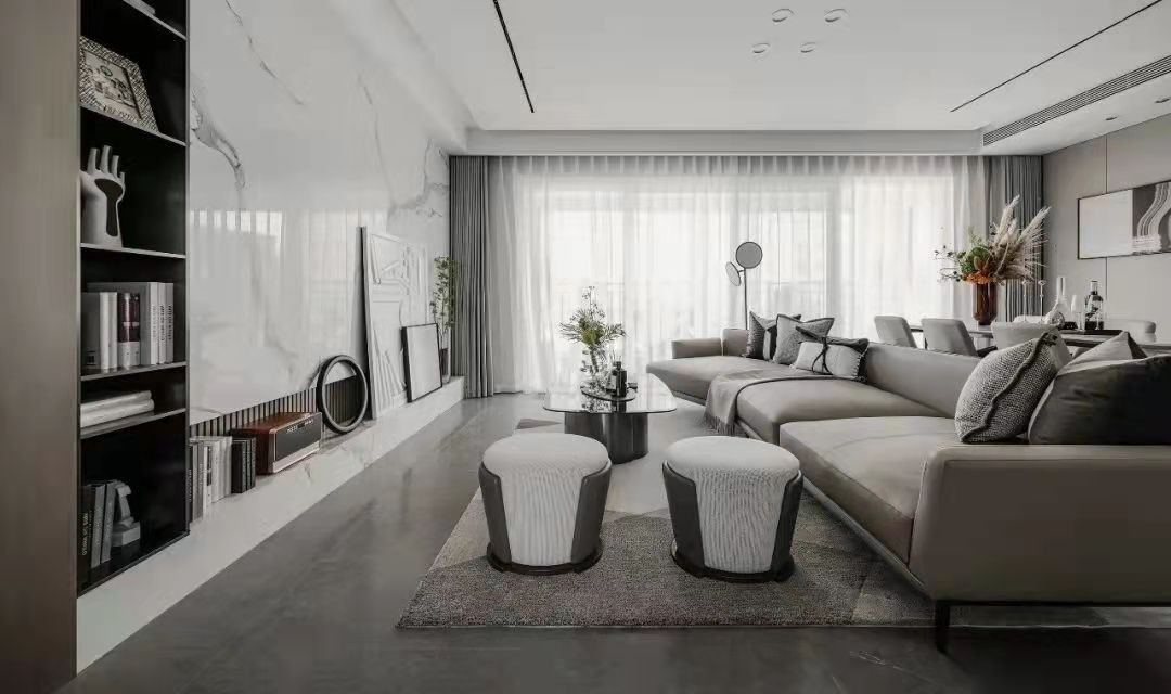 化繁为简是设计中永恒不变的话题。***灰铺满整个客厅,皮面沙发与大理石墙面对立而置,陈设减少颜色的铺张,仅由数枝植物打破沉闷的画面,点亮空间的艺术气息。