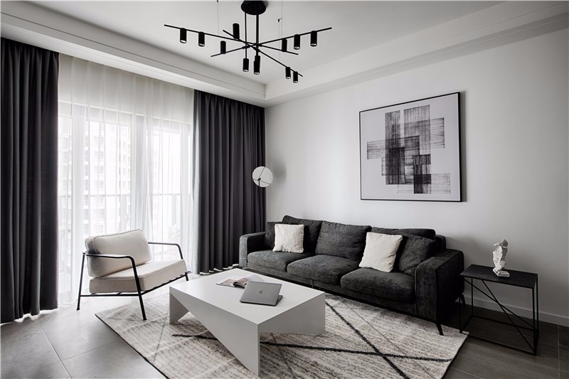 客餐厅部分的墙面用色则采用经典的黑白灰三色进行组合分布,例如电视墙斜线外使用黑色,斜线内使用白色,整个过道区域及餐厅D面使用色卡上3号灰色。其余墙面则使用白色。此种组合上色,让墙面的黑白灰三色对比充分表达