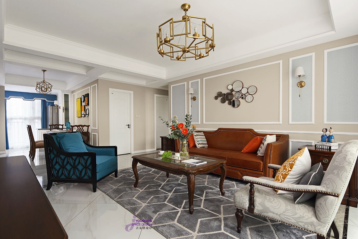 与餐厅相对的厨房的另一侧,一般都有一个不太大的便餐区,厨房的多功能还体现在家庭内部的电视背景、沙发背景都以石膏线条修饰,提高了整体空间的层次氛围,完美得诠释了简约美式的生活态度,清新的墙面颜色脱离了繁闹的都市生活