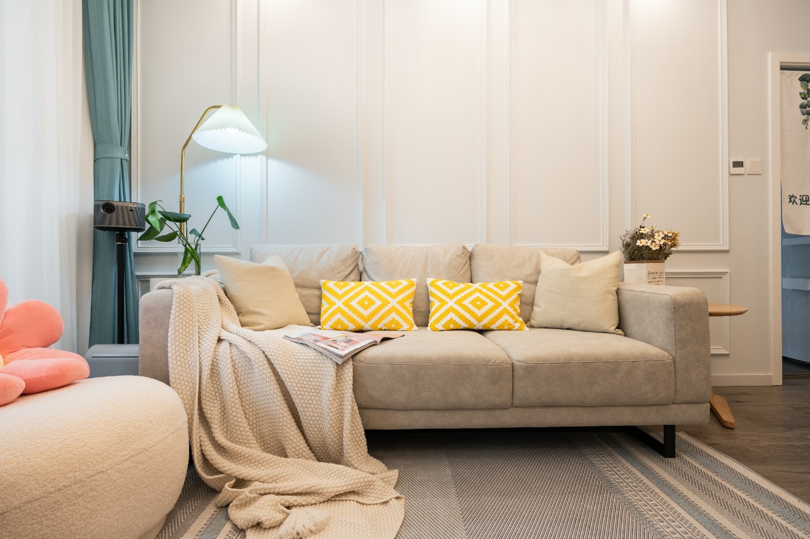 ▲沙发和地毯都以米灰色调来营造整个空间简洁干净的氛围,作为主角再搭配一些亮色靠枕,马上成为客厅亮点。