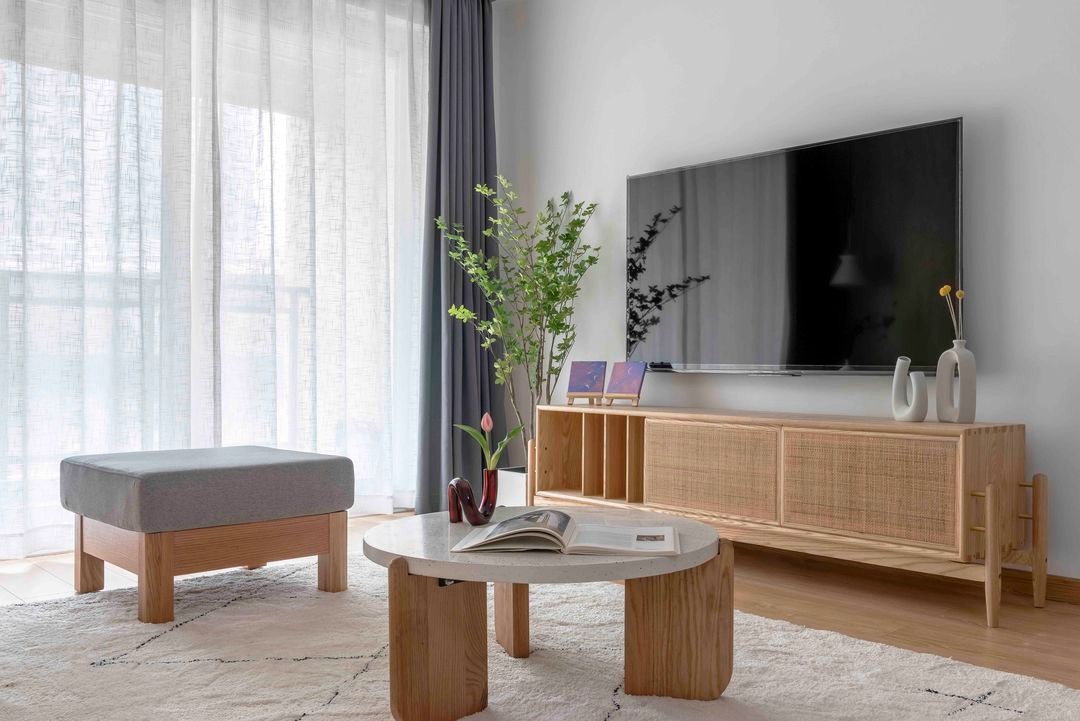 客厅所有的软装,均选用藤编、绿植、木质、棉麻等自然朴素的材质,为新家定下了从容安定的生活基调。