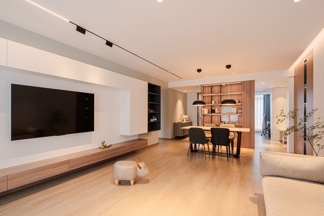 业主是传统的三口之家,需求并不复杂,但需要设计上的一些新意。如果按往常的做法,就是设置玄关、客厅、餐厅的组合,收纳等功能都往墙边靠。为了做出新意,把进门玄关的部分做成了一个盒子,将那些分散的功能需求(玄关、收纳、冰箱、展示等等功能),都集中到了这个盒子里来。盒子的出现让整个玄关区域形成了回游动线,其他空间就没有硬性的阻隔,整体是个很开放的状态。