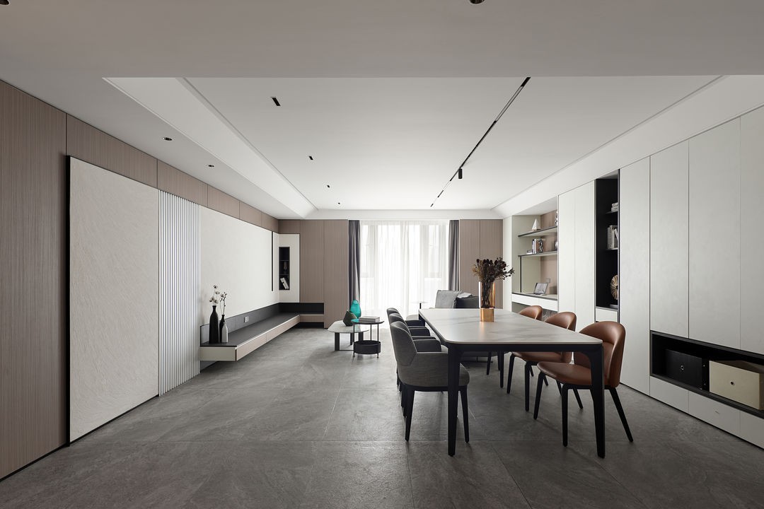 电视墙以及过道墙面均使用的木饰面,整体的效果更类似整个空间的一个“环岛”,电视墙中间是肌理漆于金属的结合,粗糙肌理与精致的金属,白色与黑色形成了强烈的对比关系,强化了线型结构。在前期布线的时候提前预埋了横向50管,将TV与网线都迁移到了右侧的开放格后面,为的是机顶盒不外露。卫生间门使用的是隐框门,好处在于效果接近于隐形门而且时间长了之后门也不会发生变形。