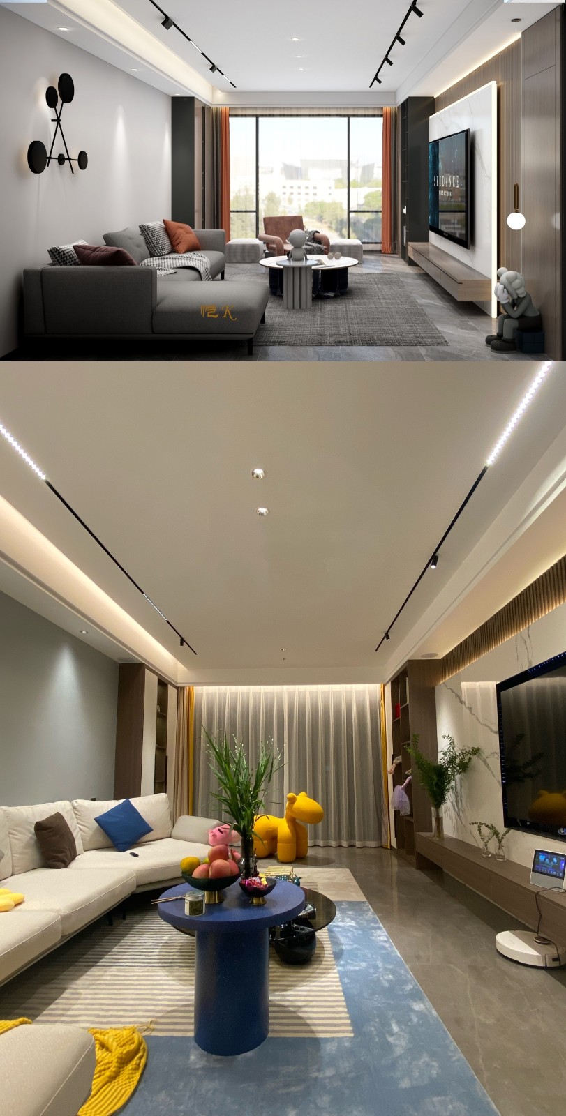 全屋采用了无主灯的设计,与晚上拍摄的实景图做对比。色彩搭配上以冷色调中的灰色和暖色调中的咖色为主,以低饱和度的冷暖色烘托环境的居家感。软装家具以及配饰上延续"蓝色"与"黄色"的主色调,运用岩板和金属的材质提升色彩质感。