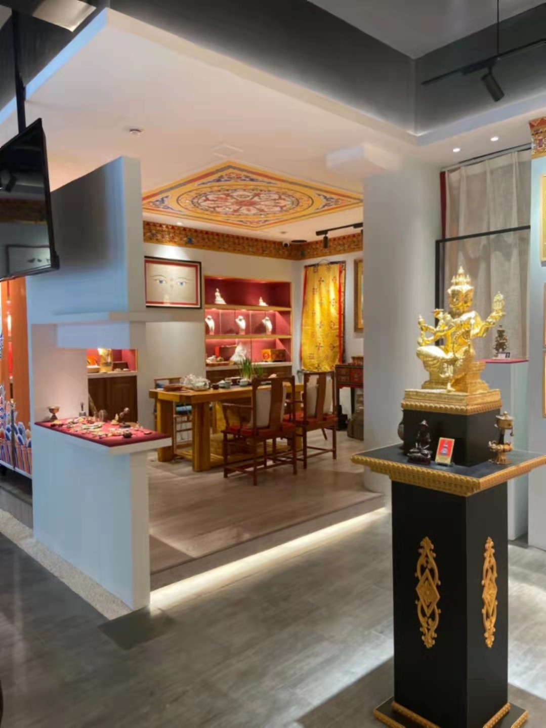 独立的展示区域尽显客户的展示所需,解除传统的木制品定制展示,通过墙体的几何切割来做出收藏展示的区域,通过色彩和灯光体现藏传物件的底蕴。