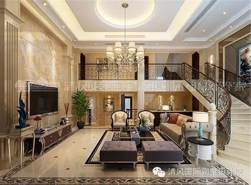 客厅做了挑高,让空间看起来更加的旷阔,旋转楼梯通上二楼,同时对客厅空间做了更加高效的利用。