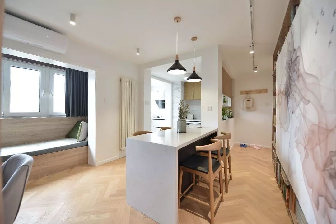白色的大理石桌面搭配木质的椅子,和整体的配色相互呼应。厨房属于半开放式的,灶台被放在了靠窗的位置,更不用担心油烟的问题