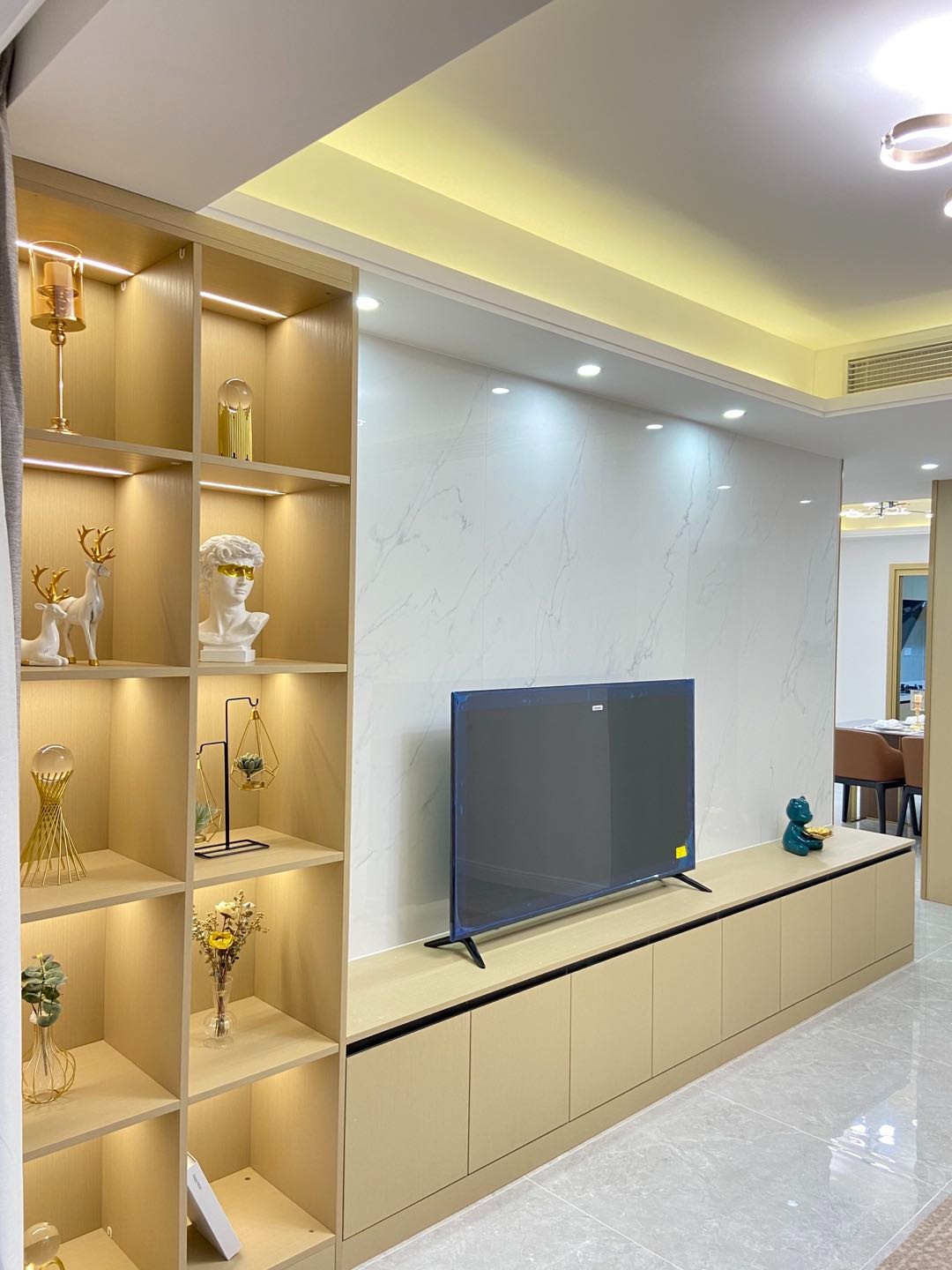 入墙式的电视柜,电视柜则是与两侧收纳柜联通,地面铺一块浅灰的地毯,整个空间都显得格外精致优雅。