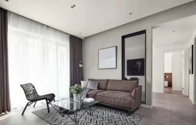 客厅整体以纯净白色为主,放大空间的同时,更显明亮,不会觉得压抑。在黑白灰的基调下,利用棕色系沙发搭配鱼骨地垫,创造出和谐美感。