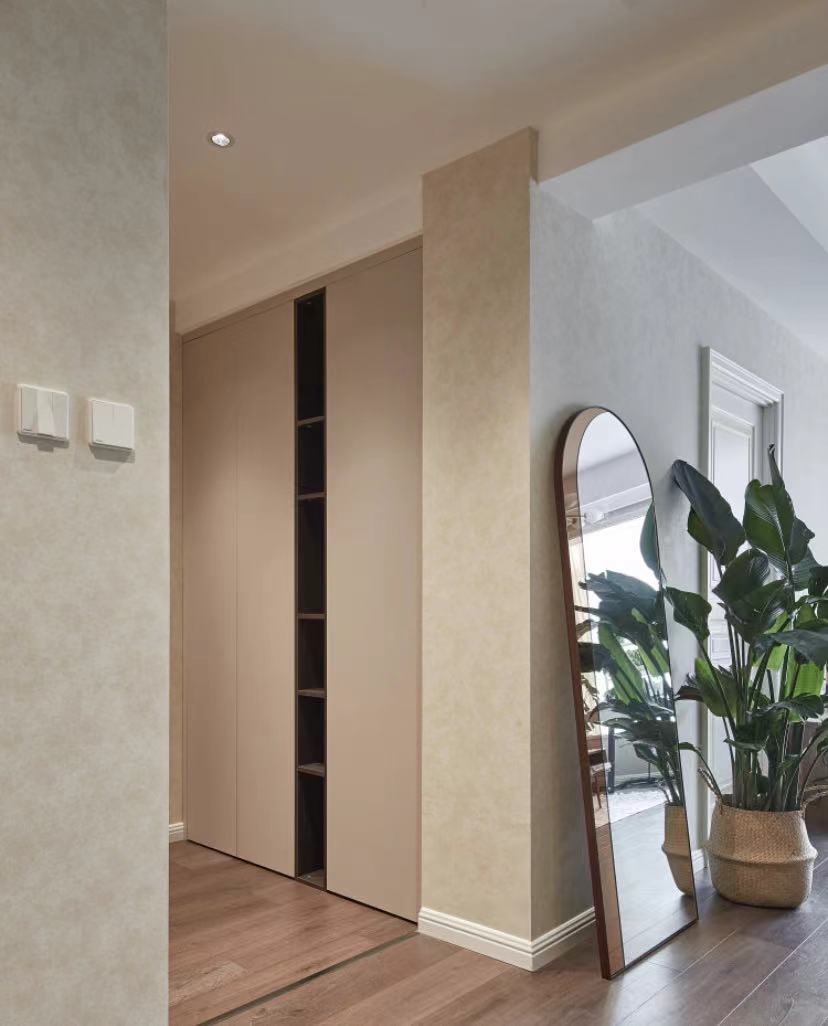 利用户型本身的优势,创造了一个独有的入户玄关,避免了原本进门一眼望穿的尴尬。于是进门的旁边做了一排玄关柜,增大了入户的收纳功能,使进门后鞋子和衣服都有了去处。