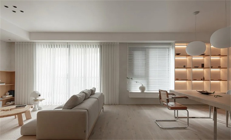 餐厅,整体延伸客厅的风格,微风吹过窗帘,光影穿过百叶,原木和灯光在白色的基调下,越简单越***