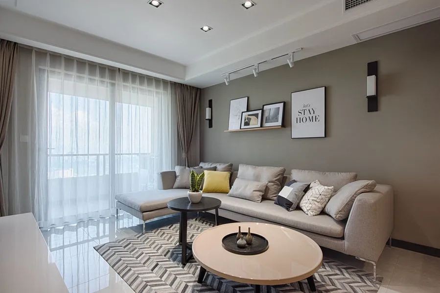 一整面的灰色墙,搭配不同的软装、家具,形成不同的分区效果。