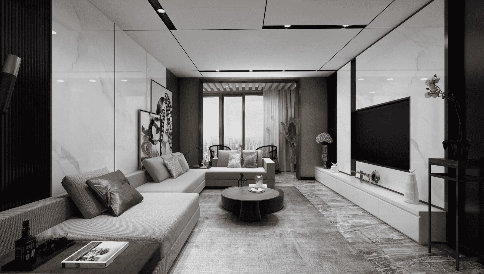 客厅开阔明朗,空间多采用灰白两色的大理石,简洁大气,视觉效果和空间体验都非常好
