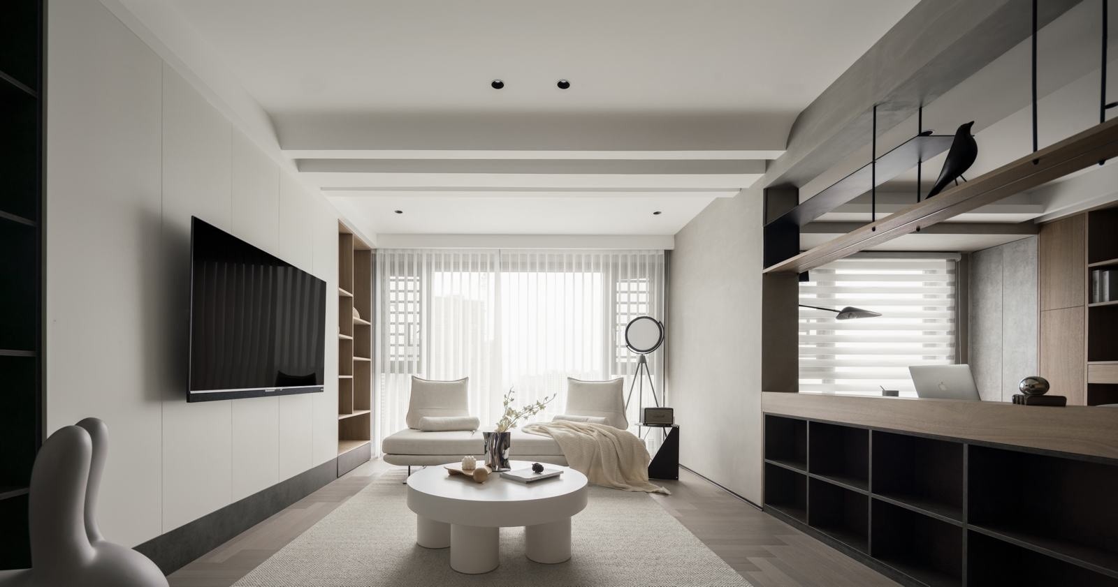 客厅取消传统的家具摆放方式,与书房形成新的空间关系,以书桌做隔断作用,使整体空间更加通透。