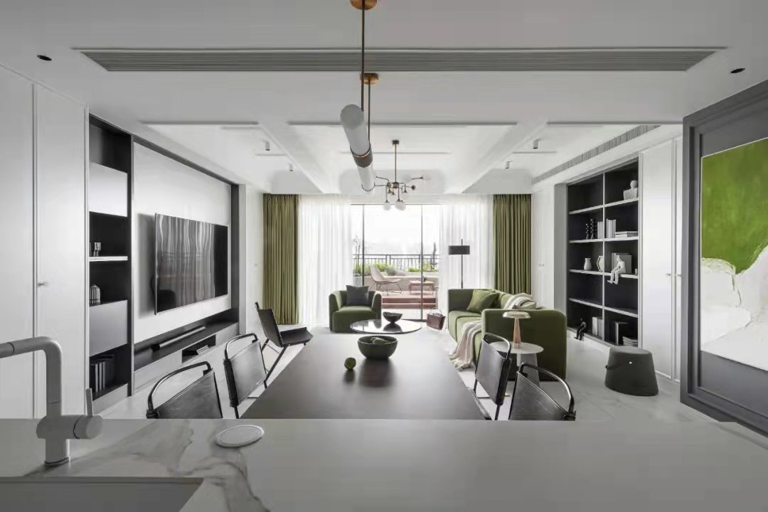 厨房、餐厅、客厅呈一字型分布,视线开阔。餐厨区域以岛台为中心,形成洄游动线。