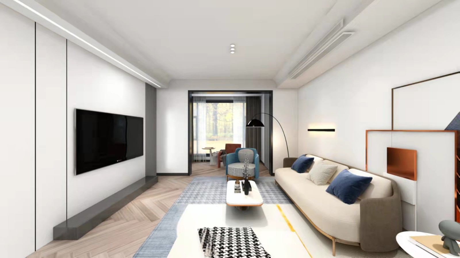 客厅用白色的墙面作为基调,凸显空间的亮度和整体性,地面采用人字铺贴增加空间的延伸感,电视墙采用墙面和线条的造型,让空间层次感更强,顶面采用无主灯吊顶,符合现代简约的主调