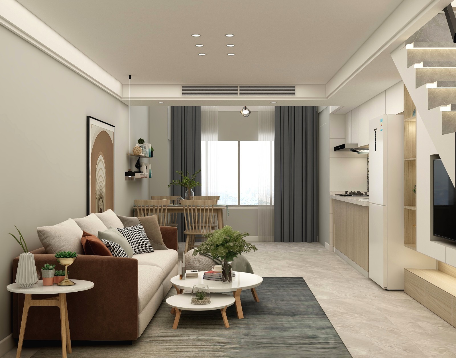 客厅利用钢结构间隙做无主灯设计,以筒灯 射灯 二层吊灯 灯带相辅相成,客厅做中央空调,根据空调整***置做边吊和双眼皮吊顶。