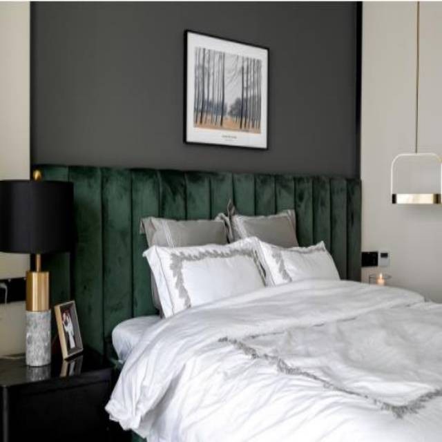 墨绿色丝绒软包床头,带点贵族气质又文艺含蓄,装饰画的色调也形成呼应