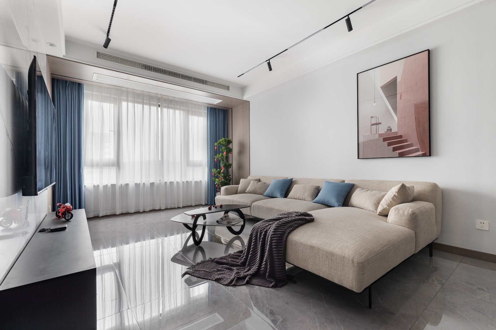 客厅无主灯设计,仅以两条轨道灯带来照明,简约之感跃然而出。