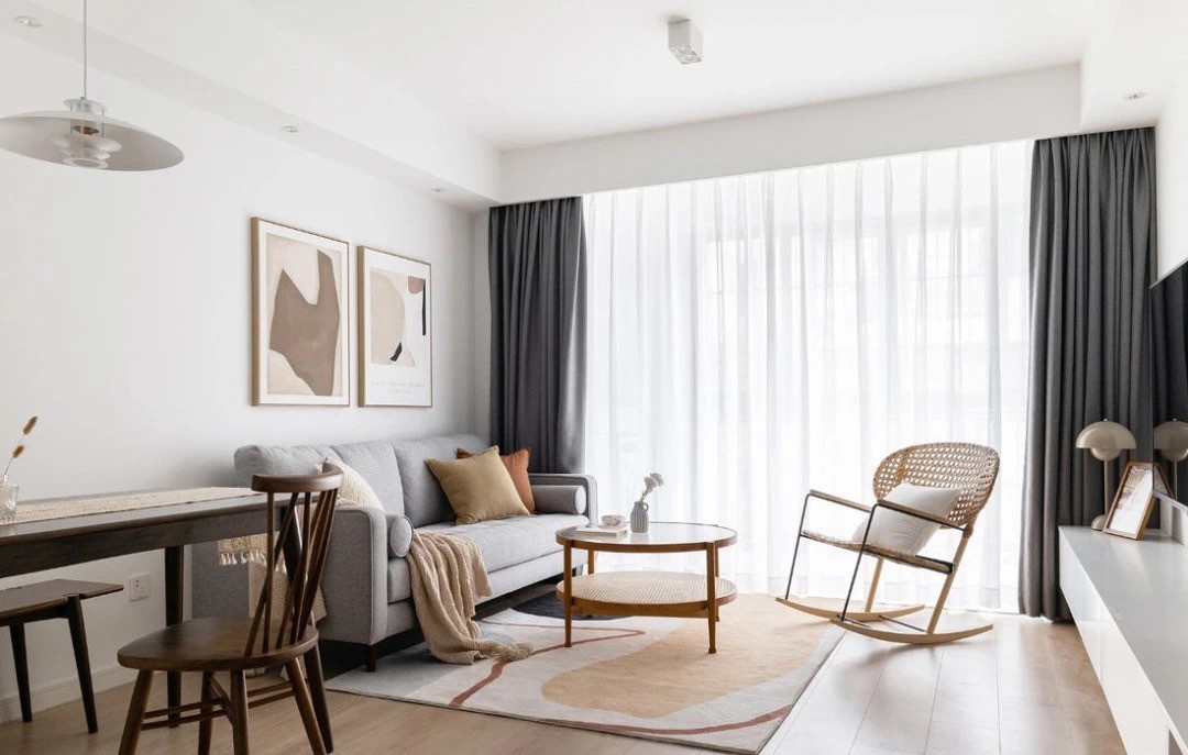 客厅整体色调较浅,质感温暖,简单的家具和灯具,搭配灰色系的窗帘,原木的元素比较充足。